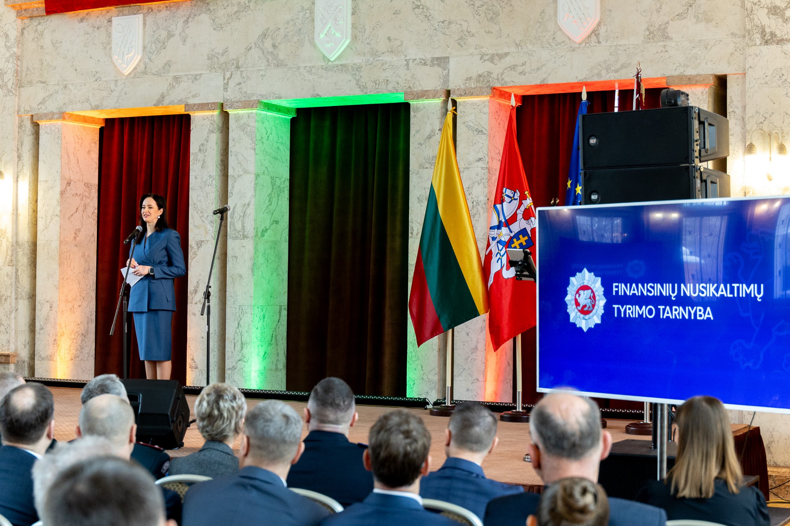 Ministrė Pirmininkė Inga Ruginienė ketvirtadienį pasveikino Finansinių nusikaltimų tyrimų tarnybos pareigūnus su 29-osiomis institucijos įkūrimo metinėmis.